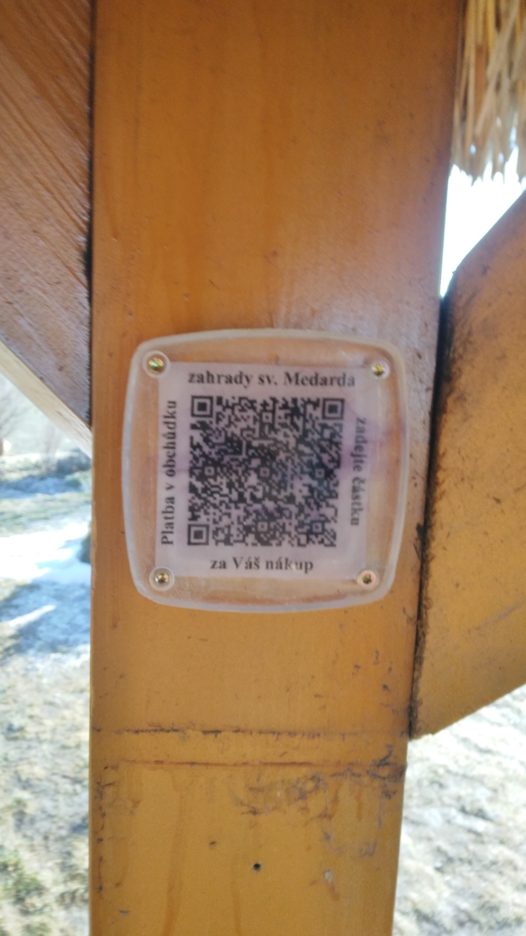 Náš obchůdek s dřevěnými zvířátky v altánku přešel na bezhotovostní platbu přes QR kód (připevněn na sloupku). Prosíme o vyplnění vaší celkové částky za nákup. Díky.